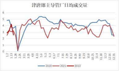焊鍍管廠冬儲水平偏低。據(jù)網(wǎng)調(diào)研,截至1月21日,天津唐山邯鄲主流管廠廠內(nèi)總體庫存67.82萬噸,比上月同期降1.45萬噸,下降2.09%;比去年農(nóng)歷同期降11.63萬噸,下降14.64%。廠內(nèi)原料帶鋼庫存24.55萬噸,比上月同期降7.11萬噸,比去年農(nóng)歷同期降7.32萬噸;焊管庫存15.47萬噸,比上月同期增0.31萬噸,比去年農(nóng)歷同期降1.84萬噸;鍍鋅管庫存27.8萬噸,比上月同期增5.35萬噸,比去年農(nóng)歷同期降2.47萬噸。1月中旬左右因冬奧會管控供應階段偏緊預期出現(xiàn),但市場普遍對2月行情回暖高度及周期看法謹慎,加工類及協(xié)議貿(mào)易商多理性冬儲,整體庫存控制在15-20天銷量左右,部分地區(qū)受工程回款及疫情影響較大,庫存偏低。1月20-25日北方管廠陸續(xù)停產(chǎn)放假,在產(chǎn)產(chǎn)能利用率下降至62.55%;南方部分管廠接年后訂單幾千噸至萬噸左右,產(chǎn)線在28日-29日左右停工,原料儲備至2月用量(見圖4)。