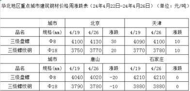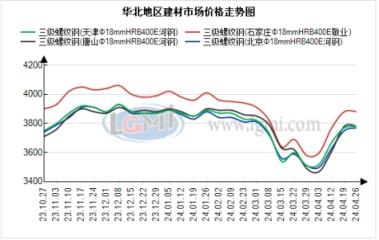 云商平臺監(jiān)測數(shù)據(jù)顯示,截至4月26日午間,天津市場Φ18mm三級抗震螺紋鋼價(jià)格為3780元,比上周同期價(jià)格漲10元;北京市場Φ18mm三級抗震螺紋鋼價(jià)格為3770元,比上周同期價(jià)格漲20元;唐山市場Φ18mm三級抗震螺紋鋼價(jià)格為3780元,比上周同期價(jià)跌10元;石家莊市場Φ18mm三級抗震螺紋鋼價(jià)格為3880元,與上周同期價(jià)格持平。