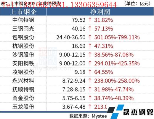 免責聲明:本網站(山東聊城晟杰無縫鋼管廠www.hccoo.com)刊載的“2021年鋼企利潤創新高,中信特鋼實現凈利近80億”等均源于網絡,版權歸原作者所有,且僅代表原作者觀點,本文所載信息僅供參考。轉載僅為學習與交流之目的,如無意中侵犯您的合法權益,請及時聯系刪除。本網站刊登此篇文章并不意味著本站贊同其觀點或證實其內容的真實性,我們不對其科學性、嚴肅性等作任何形式的保證。如果侵犯了您的版權,請盡快聯系我們予以撤銷,謝謝合作!