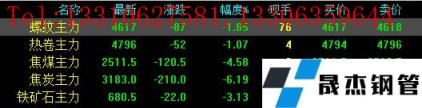 今日螺紋主力期貨跌87,收報4617,跌幅1.85%;熱卷主力跌52,收報4796,跌幅1.07%;焦煤主力跌120.5,收報2511.5,跌幅4.58%;焦炭主力跌210,收報3183,跌幅6.19%;鐵礦石主力跌22,收報680.5,跌幅3.13%。