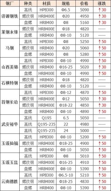 3月3日內蒙古豐鎮航豐特鋼上調50,調后:重廢8以上3300,剪切料一級3210,要求5-6厚,剪切料二級3130要求3-4厚,鋼筋壓塊3180,鐵絲、龍骨壓塊2750,機生鐵3150,暖氣片3100,鐵屑看貨給價,鋼絲繩2700。汽車前后橋3200,不含稅,單位:元/