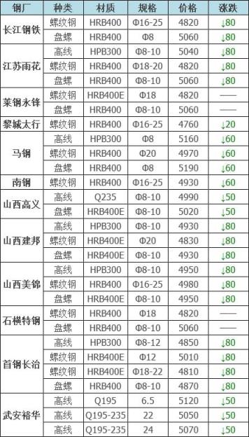 15日廣東河源德潤鋼鐵到廠跌30:鋼筋切粒3460;邊角料,新鋼板料3430;純鋼筋頭,直鋼筋3410;模具鋼、料頭圓鋼、軌道鋼、火車輪3410;硅鋼片停收;冷軋、熱軋、碎料沖子3360;優(yōu)重3410;鍛打料、馬蹄鐵3410;重廢3360;機械生鐵、高碳鋼、鑄鋼件、生熟混裝3360厚剪3310不含稅