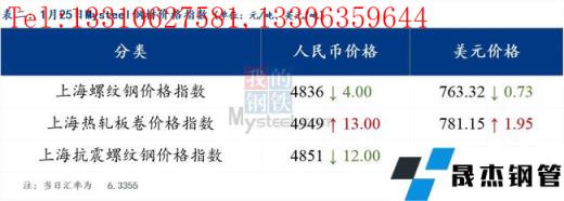1月25日Myspic普鋼絕對(duì)價(jià)格指數(shù)變化:綜合指數(shù)5041.97,上漲3.92;螺紋鋼指數(shù)4820.87,上漲2.99;線材指數(shù)5152.2,上漲3.65;熱軋板卷指數(shù)4899.57,下跌0.04;冷軋板卷指數(shù)5399.91,下跌2.72;中厚板指數(shù)5040.29,上漲9.0。