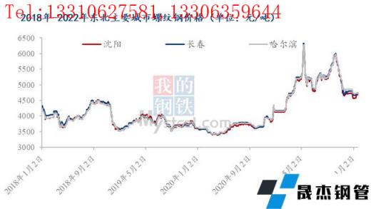 每年進入12月份后、東北建筑鋼材市場因下游工程大部分停工、需求銳減,而無縫鋼管廠多忙于北材南下無暇北顧,供需兩弱狀態下,價格對成交難以造成較大影響,商家也懶于調整對外報價,所以市場多數平穩運行為主,而今年進入1月后、市場價格仍出現了比較明顯的反季運行征象,截至2022年1月26日,東北地區主要建筑鋼材市場HRB400E螺紋鋼φ22mm報收4730-4750元/噸,較2021年12月底拉漲0-180元/噸。