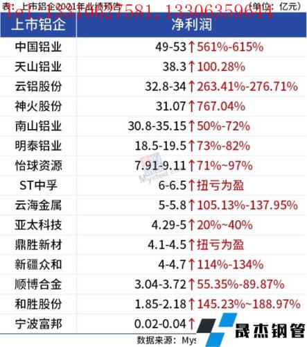 免責聲明:本網站(山東聊城晟杰無縫鋼管廠www.hccoo.com)刊載的“15家上市鋁企2021年業績飄紅,神火股份大增超7倍”等均源于網絡,版權歸原作者所有,且僅代表原作者觀點,本文所載信息僅供參考。轉載僅為學習與交流之目的,如無意中侵犯您的合法權益,請及時聯系刪除。本網站刊登此篇文章并不意味著本站贊同其觀點或證實其內容的真實性,我們不對其科學性、嚴肅性等作任何形式的保證。如果侵犯了您的版權,請盡快聯系我們予以撤銷,謝謝合作!