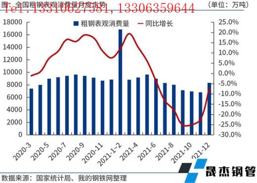 2021年12月份,全國粗鋼日均產量278.04萬噸,環比大增20.3%,預計1月份產量變化不大。臨近春節假期,鋼市進入傳統需求淡季。不過,由于多部門集中出臺穩增長政策,市場情緒得到提振,加之無縫鋼管廠家集中補庫,原燃料價格強勢上漲,推動鋼價震蕩偏強運行。今年我國基建投資有望發力,但房地產投資不容樂觀,鋼鐵消費或弱于去年。如果節后無縫鋼管廠家適度控制產能釋放,合理安排復工復產進度,實現供需動態平衡,鋼價或延續震蕩偏強運行。