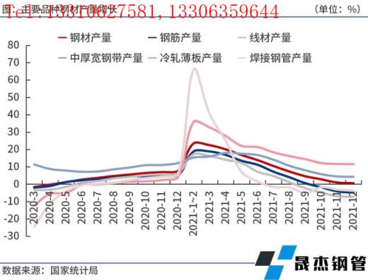 按鋼材品種來看,2021年1-12月份,我國鋼材產量13.37億噸,同比增長0.6%。其中,鋼筋產量2.52億噸,同比下降4.8%;線材產量1.56億噸,同比下降7.2%;冷軋薄板產量4510.9萬噸,同比增長11.6%;中厚寬鋼帶產量1.79億噸,同比增長4.3%;焊接鋼管產量5883.2萬噸,同比下降3.7%。