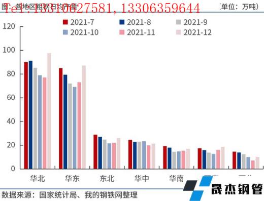 2021年12月份,華北、華東、東北、華中、華南、西南、西北等地區粗鋼日均產量分別為97.6萬噸、87.1萬噸、26.2萬噸、21.4萬噸、17.0萬噸、18.7萬噸和10.2萬噸,分別較上月增加20.5萬噸、14.0萬噸、4.1萬噸、1.3萬噸、1.6萬噸、2.6萬噸和3.0萬噸。