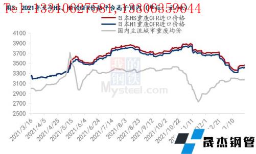 放開(kāi)廢鋼進(jìn)口后的首年,進(jìn)口量卻不及預(yù)期,2021年進(jìn)口總量?jī)H為55.5萬(wàn)噸,遠(yuǎn)低于2019年之前平均每年200萬(wàn)噸以上的水平。原因主要有兩方面:一是政策導(dǎo)向,2021年能夠入境的再生鋼鐵料所對(duì)應(yīng)的海關(guān)商品編碼只有5類,其對(duì)應(yīng)的海關(guān)編碼分別是:7204100010(鑄鐵碎料)、7204210010(不銹碎料)、7204290010(其他合金碎料)、7204410010(粉狀廢料)、7204490030(其他廢碎料),上述類別均屬于純凈的優(yōu)質(zhì)廢鋼,政策決定了廢鋼的進(jìn)口門(mén)檻變高;二是以日本優(yōu)質(zhì)重廢HS、H1為例,兩種料形的CFR價(jià)格平臺(tái)在2021年中均高于國(guó)內(nèi)主流城市的重廢均價(jià)(圖3),由于這兩種料形均屬于日本國(guó)內(nèi)的優(yōu)質(zhì)廢鋼,其資源量本身就有限,出口量不大,外加?xùn)|亞地區(qū)的其他國(guó)家也會(huì)從日本進(jìn)口該料形,所以這種優(yōu)質(zhì)廢鋼在2021年中基本處于供小于求的狀態(tài),價(jià)格因此高企。但以日本中廢H2為例,由于該料形要差于HS、H1,所以H2料形的CFR價(jià)格平臺(tái)接近國(guó)內(nèi)主流城市的中廢均價(jià)(圖4)。