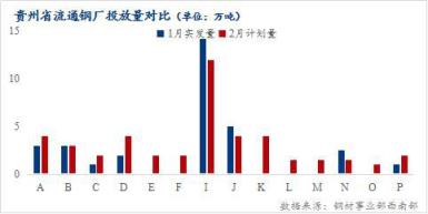 2、2月份貴州省建筑厚壁無縫鋼管資源計劃投放量45萬噸,較上個月增加11萬噸萬噸,增幅達32.35%,主要是2月中旬本地電爐企業(yè)基本復產,資源投放加大,而貴州價格逐步擺脫洼地,春節(jié)期間省外累庫速度明顯,2月份恐加大對貴州區(qū)域資源投放。