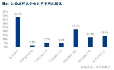 5、調研企業庫存情況發現:今年企業訂單狀況較去年節后同期相比有明顯好轉,企業訂單較去年持平和增加的樣本比例高達87.7%,僅12.3%的樣本企業訂單狀況較去年有所下滑,其中訂單數下滑20%以上的企業占比3.9%。出口方面,40.9%的企業出口訂單量較去年同期比基本持平,43.6%的企業出口訂單量同比有增長,15.5%的企業出口訂單同比有下降,主要是受全球疫情,以及中美貿易摩擦的影響。