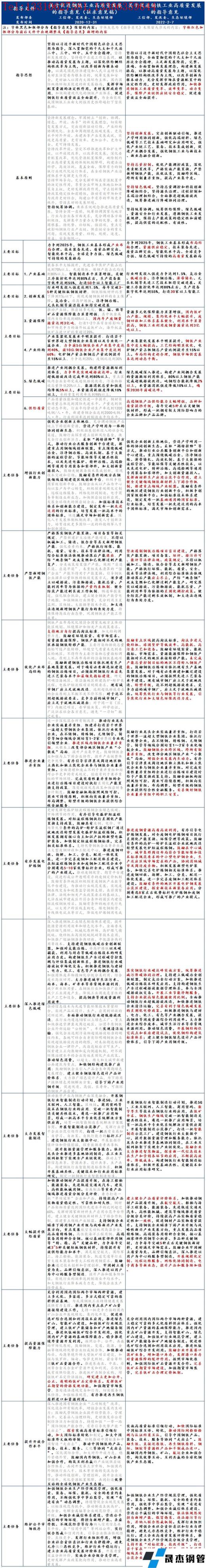 對于《指導意見》的理解,首先要明確的是,《指導意見》是在2020年12月31日工信部發布的《關于推動鋼鐵工業高質量發展的指導意見(征求意見稿)》(以下簡稱《征求稿》)的基礎上,經過一年多時間收集業內專家學者、各地鋼鐵行業協會、主要無縫厚壁鋼管廠家等反饋內容,并結合《“十四五”原材料工業發展規劃》(以下簡稱《原材料規劃》)以及《“十四五”節能減排綜合工作方案》(以下簡稱《節能減排》)內鋼鐵行業相關條例整合而成的,對于目前的中國鋼鐵行業而言,《指導意見》具有“錨定”的重要地位。