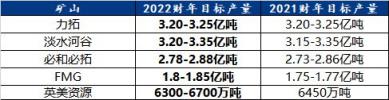 ◎ 澳洲巴西19港發運量顯示,2021年澳巴鐵礦發運總量12.77億噸,環比增加1701萬噸,增量主要來自于巴西。根據各大礦山2022財年生產計劃情況來看,力拓和淡水河谷目標產量與去年基本持平,必和必拓和FMG均存在一定增量,并且高礦價下,其它礦山例如英美等也將有一定增產的潛力,預計2022年全球鐵礦石產量同比將小幅增加。