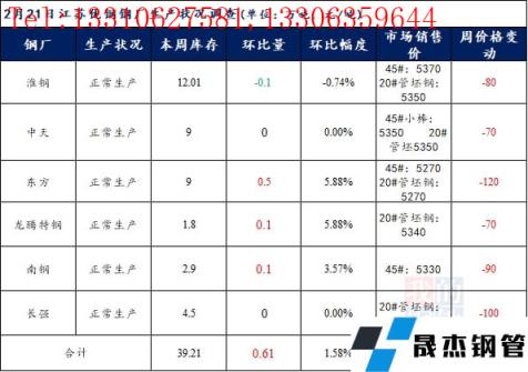 江蘇優(yōu)特無縫厚壁鋼管廠家棒材總庫存39.21萬噸,較上周上升0.61萬噸,環(huán)比增1.58%,較去年同期下降8.3萬噸,同比降17.47%,目前江蘇優(yōu)特無縫厚壁鋼管廠家均正常生產(chǎn)。
