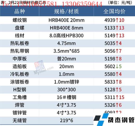 建筑厚壁無縫鋼管:2月22日,全國31個主要城市20mm三級抗震螺紋鋼均價4939元/噸,較上個交易日上漲10元/噸。短期來看,消費雖有恢復預期但下游資金到位情況較差,前期偏高的春季消費預期大概率將被證偽,若本周需求仍無明顯好轉跡象,則現貨存在繼續下跌的風險,預計23日國內建筑厚壁無縫鋼管或將穩中趨弱運行。