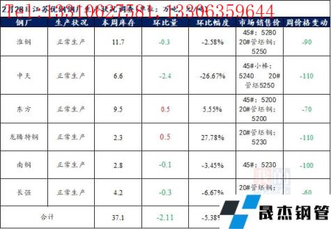 江蘇優特無縫厚壁鋼管廠家棒材總庫存37.1萬噸,較上周下降2.11萬噸,環比降5.38%,較去年同期下降9.25萬噸,同比降19.96%,目前江蘇優特無縫厚壁鋼管廠家均正常生產。