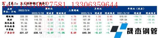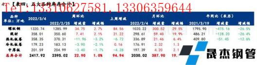 庫存方面,五大品種厚壁無縫鋼管總庫存春節后連續累增5周,環比上周增加22.9萬噸,增幅1%。分品種看,建材庫存增加42.16萬噸,增幅為2.6%;板材庫存減少19.26萬噸,降幅2.5%;分指標看,五大品種無縫厚壁鋼管廠家庫存環比減少6.49萬噸,降幅1%;五大品種社會庫存環比增加29.39萬噸,增幅1.7%。