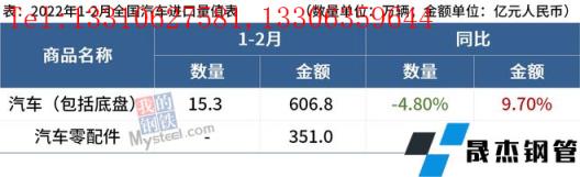 免責聲明:本網站(山東聊城晟杰無縫鋼管廠www.hccoo.com)刊載的“海關總署:1-2月中國出口汽車47.7萬輛,同比增99.10%”等均源于網絡,版權歸原作者所有,且僅代表原作者觀點,本文所載信息僅供參考。轉載僅為學習與交流之目的,如無意中侵犯您的合法權益,請及時聯系刪除。本網站刊登此篇文章并不意味著本站贊同其觀點或證實其內容的真實性,我們不對其科學性、嚴肅性等作任何形式的保證。如果侵犯了您的版權,請盡快聯系我們予以撤銷,謝謝合作!