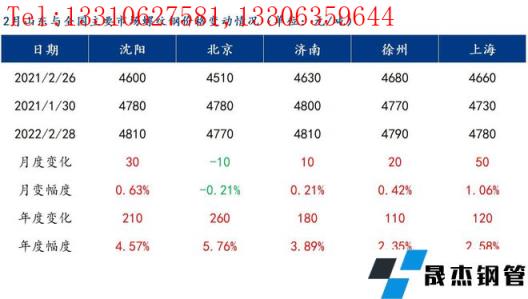 2月,山東建筑厚壁無縫鋼管價格窄幅震蕩上行。截至2月28日,山東建筑厚壁無縫鋼管價格(螺紋鋼為例)從上月跌4800元/噸上漲至4810元/噸,環(huán)比上漲10元/噸、漲幅0.2%。全月最高價格4930元/噸,最低價格4750元/噸,波動幅度180元/噸。雖然2022年2月平均價格較去年上漲了392元/噸,較2020年上漲了1243元/噸,但是對比來看,今年2月震蕩幅度相對較小,價格要溫和的多。
