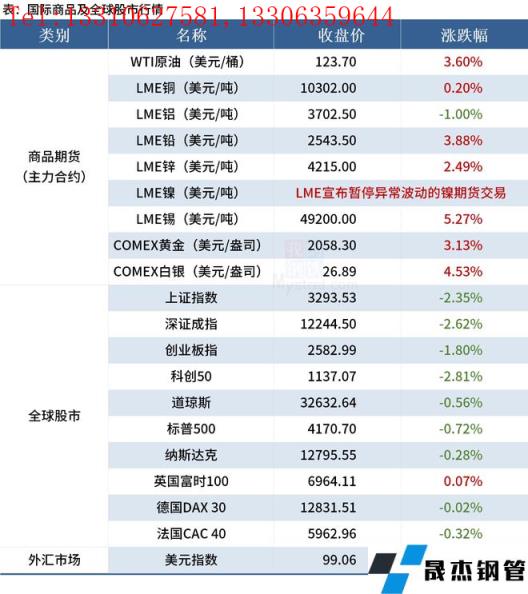 免責聲明:本網站(山東聊城晟杰無縫鋼管廠www.hccoo.com)刊載的“2022年03月09日早讀:LME緊急切斷鎳期貨交易,美宣布禁止進口俄羅斯石油”等均源于網絡,版權歸原作者所有,且僅代表原作者觀點,本文所載信息僅供參考。轉載僅為學習與交流之目的,如無意中侵犯您的合法權益,請及時聯系刪除。本網站刊登此篇文章并不意味著本站贊同其觀點或證實其內容的真實性,我們不對其科學性、嚴肅性等作任何形式的保證。如果侵犯了您的版權,請盡快聯系我們予以撤銷,謝謝合作!