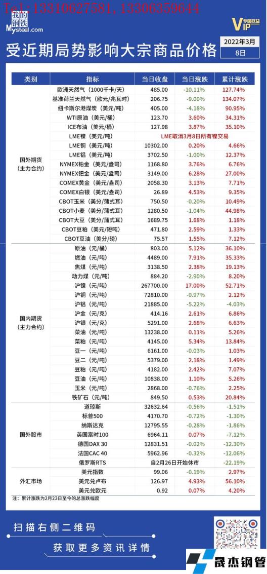 免責聲明:本網站(山東聊城晟杰無縫鋼管廠www.hccoo.com)刊載的“受近期局勢影響大宗商品價格一覽表(3月8日)”等均源于網絡,版權歸原作者所有,且僅代表原作者觀點,本文所載信息僅供參考。轉載僅為學習與交流之目的,如無意中侵犯您的合法權益,請及時聯系刪除。本網站刊登此篇文章并不意味著本站贊同其觀點或證實其內容的真實性,我們不對其科學性、嚴肅性等作任何形式的保證。如果侵犯了您的版權,請盡快聯系我們予以撤銷,謝謝合作!