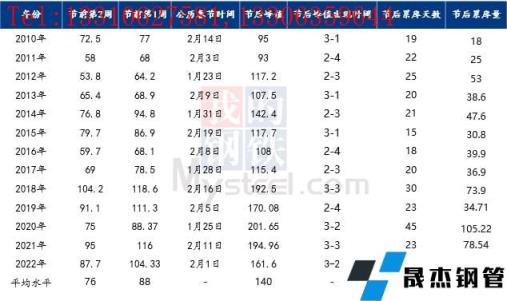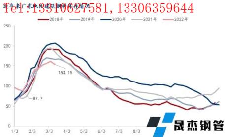 對比歷史數(shù)據(jù)來看,近10年來春節(jié)后廣州建筑厚壁無縫鋼管庫存峰值均出現(xiàn)第3-5周,累庫周期約24天左右;近5年來節(jié)后庫存累庫量明顯上升,節(jié)后峰值水平均超過150萬噸以上,而2017年之前節(jié)后庫存峰值均在140萬噸以內(nèi)。近年來,隨著經(jīng)濟發(fā)展以及供應(yīng)擴張,春節(jié)前市場主動性冬儲積極性增加,整體的庫存量出現(xiàn)明顯上升; 雖然2022年節(jié)前價格偏高,但節(jié)前現(xiàn)貨價格上漲,帶動市場不少商家主動性囤貨、備貨,節(jié)前庫存總量并未出現(xiàn)明顯累庫現(xiàn)象。節(jié)后開市,在疫情等因素影響下,累庫速度遠低于去年,今年庫存呈現(xiàn)的特點是,累庫速度快,累庫量大,周期短等特點。同時再加上今年節(jié)后不少短流程企業(yè)并未完全恢復(fù)生產(chǎn),自然資源供應(yīng)量有所減量,節(jié)后累庫低于往年,且今年峰值出現(xiàn)在3月第1周,第二周迎來庫存拐點。