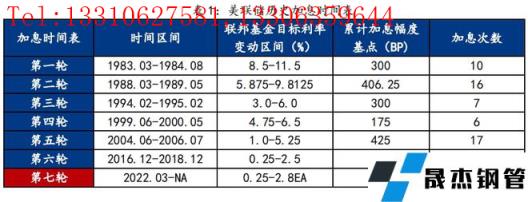 從歷史上來(lái)看(表1),美聯(lián)儲(chǔ)一共進(jìn)行了6輪加息周期,雖然美聯(lián)儲(chǔ)基于同樣的出發(fā)點(diǎn)為了控制通脹風(fēng)險(xiǎn),維持經(jīng)濟(jì)穩(wěn)步發(fā)展進(jìn)行調(diào)控,但其中造成每次加息的因素多種多樣,最早的時(shí)間可以追溯到1983年期間,美國(guó)在經(jīng)濟(jì)復(fù)蘇的初期中通脹率達(dá)到了驚人的13.5%后美聯(lián)儲(chǔ)急需控制通脹率;也不乏在1999與2004年中為了對(duì)抗互聯(lián)網(wǎng)泡沫以及房地產(chǎn)泡沫;在2016年第六輪加息中為了平衡前期充分的量化寬松。北京時(shí)間3月17日零點(diǎn)美聯(lián)儲(chǔ)第七輪加息正式落地,其中根據(jù)圖1美聯(lián)儲(chǔ)FOMC點(diǎn)陣圖做出的預(yù)判,本年度2022年加息次數(shù)將預(yù)計(jì)達(dá)到7次,并且在2023年底利率將達(dá)到2.8%。