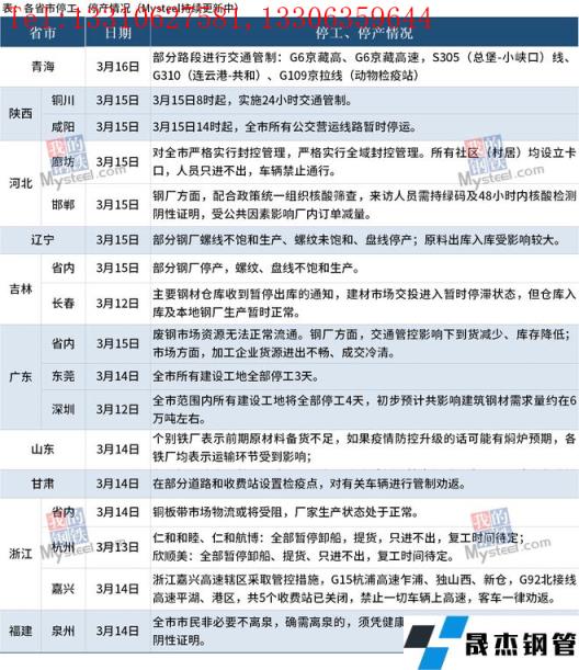 截至3月16日,匯總了10個省份最新停工停產信息。其中,廣東省3月15日開始,廢鋼市場資源無法正常流通;無縫厚壁鋼管廠家方面,交通管控影響下到貨減少、庫存降低;市場方面,加工企業貨源進出不暢、成交冷清。陜西省銅川市于15日宣布全市范圍內實施24小時交通管制;咸陽市15日宣布全市所有公交營運路線暫時停運。吉林省部分無縫厚壁鋼管廠家停產,螺紋、盤線不飽和生產。與此同時,全國其他地區鋼貿交易也受到影響,部分工地開始停工,物流運輸暫停服務。具體情況如下:
