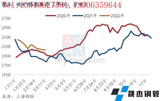 截止3月11日,45港庫存中塊礦庫存已由年初的2244萬噸降至2027萬噸,累積降幅達到9.7%。從需求來看,雖然1季度無縫厚壁鋼管廠家對塊礦的使用配比成下跌趨勢,但是由于限產放松,無縫厚壁鋼管廠家復產增多,日均鐵水產量較去年年底明顯上升,由去年12月的均值200.1萬噸增至今年前兩個月均值211.1萬噸,增幅達5.5%,從而帶動塊礦需求環比上升;而供應端澳洲鐵礦石發運量由于當地礦山在完成年度沖量任務后整體出現季節性下滑,其中塊礦發運量出現明顯減量,統計到前兩個月澳塊往中國周度發運量均值為311萬噸,比12月份變化54.8萬噸,因此塊礦在供應偏緊,需求上升的情況下港口庫存持續性走低。