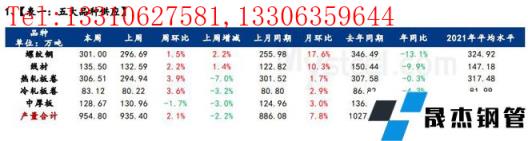 供應方面,本周五大厚壁無縫鋼管品種供應增至954.8萬噸,增量19.4萬噸,增幅2.1%,其中建材環比增量7.2萬噸,增幅1.7%,板材環比增量12.18萬噸,增幅2.4%。