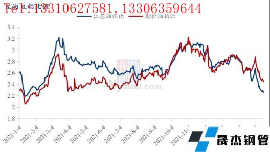 其六:3月份以來豆油價格見高回落,豆粕價格被動變得更加堅挺。3月初,豆粕期現貨價格雙雙創出階段性高位后出現一輪回撤走勢。從下圖油粕比走勢來看,2022年3月3日,江蘇地區現貨豆油豆粕比值2.68,期價主力合約豆油豆粕比值2.88;截止3月18日,江蘇地區現貨豆油豆粕比值下降至2.27,期價主力合約豆油豆粕比值下降至2.44。期間外圍CBOT大豆價格整體高位盤整為主,因此豆粕估值獲得被動提升。