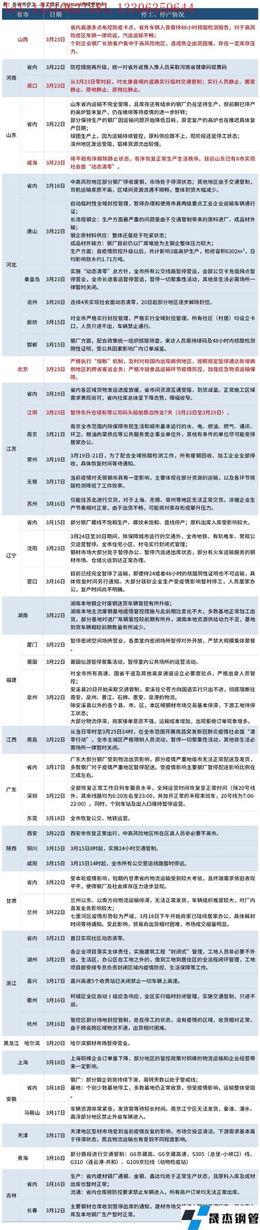 截至3月24日,匯總了20個省份停工復工最新信息。其中,3月23日,山西省內高速多點布控防疫卡點,省外車輛入晉需持48小時核酸檢測報告,對于高風險疫區(qū)車輛一律勸返,汽運運輸不暢;個別企業(yè)無縫厚壁鋼管廠家長協(xié)客戶集中于高風險地區(qū),造成焦企出貨困難,存在一定庫存壓力。河南周口從3月23日零時起,對太康縣域內道路實行臨時交通管制;實行人員靜止、居家靜止、原地靜止、原崗位靜止。山東威海于3月23日將平穩(wěn)有序解除靜止狀態(tài),有序恢復正常生產(chǎn)生活秩序,目前山東已有8市實現(xiàn)社會面“動態(tài)清零”。具體情況如下: