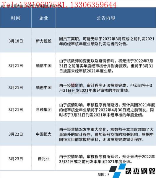 與往年相比,今年房企披露業績呈扎堆發布的特點,多集中在3月29日-31日。除此之外,截至3月24日,據不完全統計,已有6家重點房企發布公告稱將延遲刊發2021年度業績報告,公告顯示延遲原因多為疫情影響,具體情況如下: