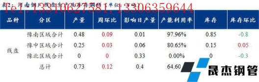 1、調研數據顯示,統計的河南地區10家建筑厚壁無縫鋼管樣本無縫厚壁鋼管廠家中,河南省無縫厚壁鋼管廠家線盤日均產量0.73萬噸,較上周小幅增加0.12萬噸;檢修/限產影響建材日產量為0.4萬噸,產能利用率64.6%,較上周上升10.62%。