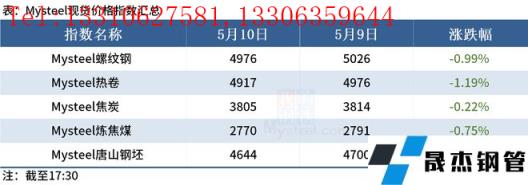 ◎5月10日焦炭市場偏弱運行,部分無縫厚壁鋼管廠家開啟第二輪降價,降幅為200元/噸,主流無縫厚壁鋼管廠家暫觀望為主。焦炭開工小幅微增,場內基本零庫存運行,即產即銷,多以積極出貨為主。詳情>>