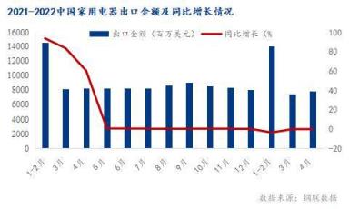 從統(tǒng)計(jì)局公布的最新數(shù)據(jù)看,2022年一季度中國(guó)家用電器累計(jì)出口金額29387百萬美元,同比下降5.3%。其中4月中國(guó)家用電器出口金額7860.0百萬美元,同比下降0.1%。