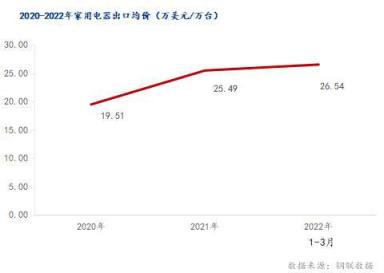 2022年一季度中國(guó)家用電器出口均價(jià)為26.54萬美元/萬臺(tái),2021年一季度家用電器出口均價(jià)為25.83萬美元/萬臺(tái)。