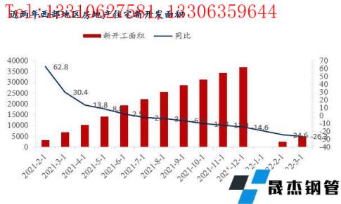 2022年以來,從上圖可以看出來,受住房不炒政策受影響,西北區(qū)域各省市房地產(chǎn)開發(fā)進(jìn)度緩慢,房地產(chǎn)開發(fā)企業(yè)投資完成額以及新開工面積同比均是小幅下降。分省市來看,陜西作為西北經(jīng)濟(jì)龍頭老大,房地產(chǎn)開發(fā)投資表現(xiàn)較好。2022年一季度,陜西省房地產(chǎn)開發(fā)企業(yè)完成投資674.03億元,同比增長5%,比1-2月提高1.8個百分點(diǎn)。而甘肅區(qū)域,一季度GDP同比增長5.3%,固定資產(chǎn)投資同比增長12.9%。其中,項(xiàng)目投資增長13.4%,房地產(chǎn)開發(fā)投資增長11.7%,商品房銷售面積下降10.7%。另外如分別是寧夏區(qū)域房地產(chǎn)開發(fā)投資增長增速為-1%。這在去年寧夏區(qū)域房地產(chǎn)開發(fā)投資增速為正數(shù),今年面臨較大下行壓力。整體來說,由于受疫情以及資金問題,工程項(xiàng)目進(jìn)度不如預(yù)期,厚壁無縫鋼管需求量同比減少,這也是前期西北區(qū)域建筑厚壁無縫鋼管消化緩慢以及庫存積壓原因。