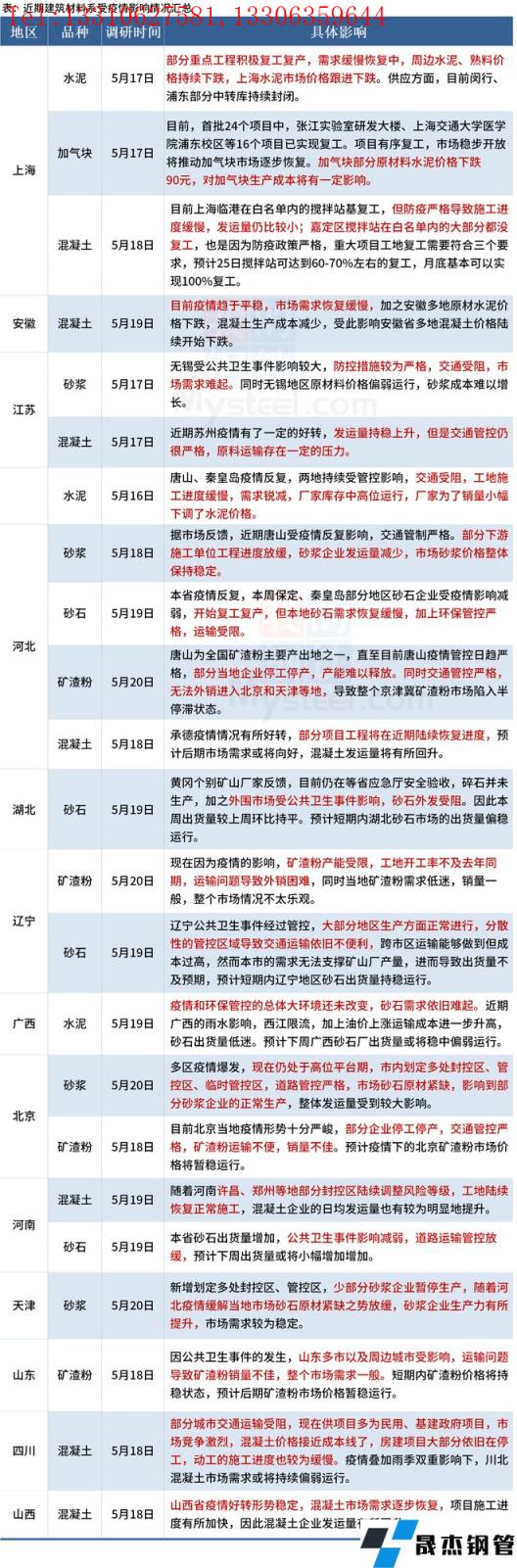 截至5月20日,據(jù)百年建筑網(wǎng)調(diào)研,14個(gè)省份建材市場受到了不同程度的影響。隨著華東、華南疫情和暴雨情況的緩解,物流運(yùn)輸逐步恢復(fù)正常,材料進(jìn)場速度加快,下游工地施工節(jié)奏提升。在疫情有效管控下,基建、房建方面的需求陸續(xù)回升,但由于疫情反復(fù)抬頭的影響,仍有上行空間有限。具體情況如下: