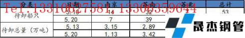 此次調(diào)研選取了南京、蘇州、無錫、常州、南通、徐州、揚州、鹽城八個城市,以建筑厚壁無縫鋼管為主要庫存的20家倉庫。通過匯總了解,當前樣本倉庫碼頭累計待卸船只總計53只,待卸總量達5.48萬噸。