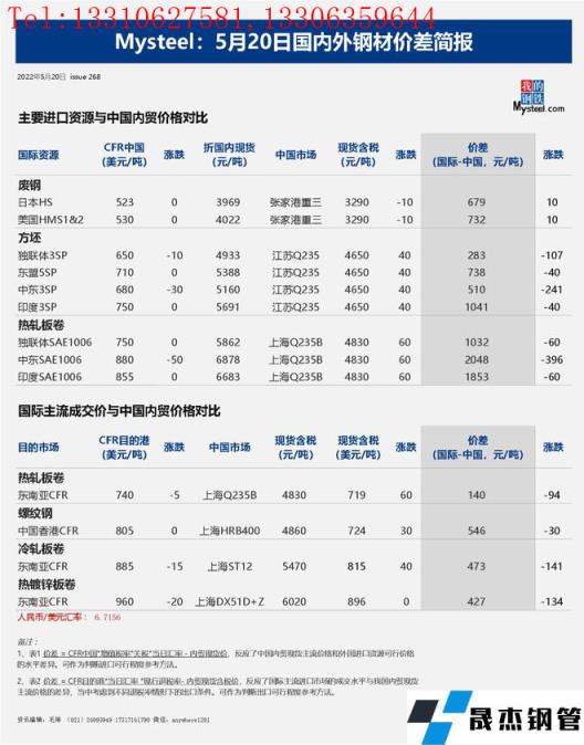 免責(zé)聲明:本網(wǎng)站(山東聊城晟杰無縫鋼管廠www.hccoo.com)刊載的“2022年05月20日日報:國內(nèi)外鋼材_無縫鋼管價差匯總(2022.5.20)”等均源于網(wǎng)絡(luò),版權(quán)歸原作者所有,且僅代表原作者觀點,本文所載信息僅供參考。轉(zhuǎn)載僅為學(xué)習(xí)與交流之目的,如無意中侵犯您的合法權(quán)益,請及時聯(lián)系刪除。本網(wǎng)站刊登此篇文章并不意味著本站贊同其觀點或證實其內(nèi)容的真實性,我們不對其科學(xué)性、嚴(yán)肅性等作任何形式的保證。如果侵犯了您的版權(quán),請盡快聯(lián)系我們予以撤銷,謝謝合作!