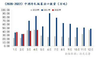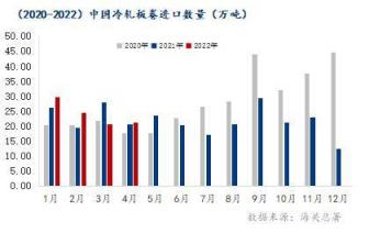 海關(guān)總署數(shù)據(jù)顯示:2022年1-4月份我國冷軋板(帶)出口總量共計159.53萬噸,年同比下降40.79%。2022年1-4月份我國冷軋板(帶)進口總量共計96.25萬噸,年同比上升1.90%。