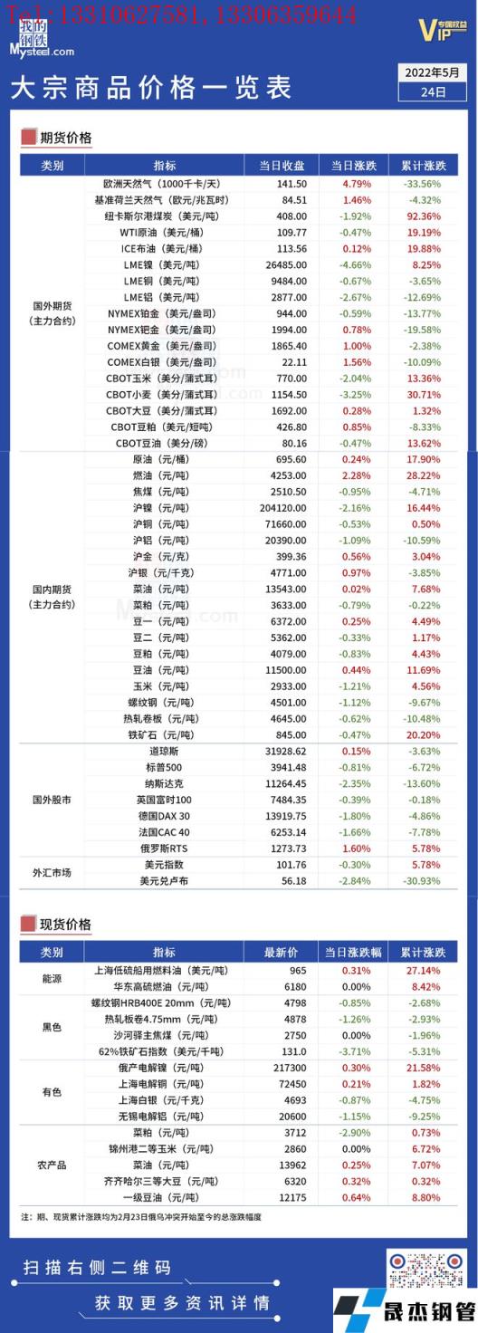 免責聲明:本網站(山東聊城晟杰無縫鋼管廠www.hccoo.com)刊載的“俄烏局勢丨大宗商品價格一覽表(5月24日)”等均源于網絡,版權歸原作者所有,且僅代表原作者觀點,本文所載信息僅供參考。轉載僅為學習與交流之目的,如無意中侵犯您的合法權益,請及時聯系刪除。本網站刊登此篇文章并不意味著本站贊同其觀點或證實其內容的真實性,我們不對其科學性、嚴肅性等作任何形式的保證。如果侵犯了您的版權,請盡快聯系我們予以撤銷,謝謝合作!