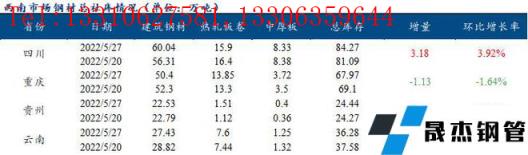 據調研,截止2022年5月27日,西南市場厚壁無縫鋼管累計社會庫存為212.96萬噸,環比增加0.92萬噸,漲幅0.43%。分省份來看,本周四川市場厚壁無縫鋼管庫存為84.27萬噸,環比增加3.18萬噸,漲幅3.92%;重慶市場厚壁無縫鋼管庫存為67.97萬噸,環比減少1.13萬噸,降幅1.64%;貴州市場厚壁無縫鋼管庫存為24.44萬噸,環比增加0.17萬噸,漲幅0.70%;云南市場厚壁無縫鋼管庫存為36.28萬噸,環比減少1.3萬噸,降幅3.46%。