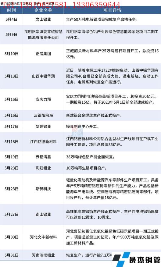 免責聲明:本網站(山東聊城晟杰無縫鋼管廠www.hccoo.com)刊載的“5月國內14個鋁項目開工、投產或復產”等均源于網絡,版權歸原作者所有,且僅代表原作者觀點,本文所載信息僅供參考。轉載僅為學習與交流之目的,如無意中侵犯您的合法權益,請及時聯系刪除。本網站刊登此篇文章并不意味著本站贊同其觀點或證實其內容的真實性,我們不對其科學性、嚴肅性等作任何形式的保證。如果侵犯了您的版權,請盡快聯系我們予以撤銷,謝謝合作!