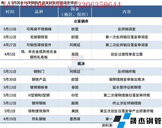 免責聲明:本網站(山東聊城晟杰無縫鋼管廠www.hccoo.com)刊載的“4-5月國外對華鋼鐵產品發起反傾銷調查情況”等均源于網絡,版權歸原作者所有,且僅代表原作者觀點,本文所載信息僅供參考。轉載僅為學習與交流之目的,如無意中侵犯您的合法權益,請及時聯系刪除。本網站刊登此篇文章并不意味著本站贊同其觀點或證實其內容的真實性,我們不對其科學性、嚴肅性等作任何形式的保證。如果侵犯了您的版權,請盡快聯系我們予以撤銷,謝謝合作!