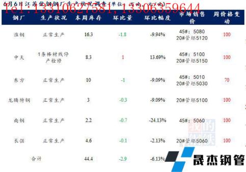 江蘇優特無縫厚壁鋼管廠家棒材總庫存44.4萬噸,較上周減少2.9萬噸,環比降6.13%,較去年同期增加7.24萬噸,同比增19.48%,目前省中天1條棒材線檢修,其余無縫厚壁鋼管廠家正常生產。