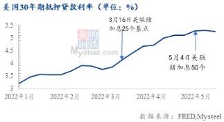 美聯儲為了抑制國內通脹,分別于3月16日和5月4日加息25和50個基點,預計將在今年累計加息100個基點。而伴隨著美聯儲的不斷加息,截至本周,30年期抵押貸款利率飆升至5.1%,處于歷史高位。