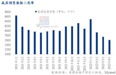在美聯儲持續加息的預期和房價居高不下的雙重壓力下,美國樓市泡沫逐漸破碎,樓市繁榮面臨考驗。我們預計5月房屋銷售數據和單戶住宅新開工數量均環比下滑,帶動著木材價格同樣走弱。