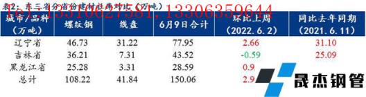 6月2日-8日本周東三省建筑厚壁無縫鋼管產量合計52.60萬噸,較上周增3萬噸;廠庫合計17.99萬噸,較上周增2.75萬噸;總社庫150.06萬噸,較上周增2.99萬噸。